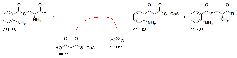 | Definition | S-Anthraniloyl-L-cysteinyl-protein + Malonyl-CoA <=> (2-Aminobenzoyl)acetyl-CoA + CO2 + S-Anthraniloyl-L-cysteinyl-protein