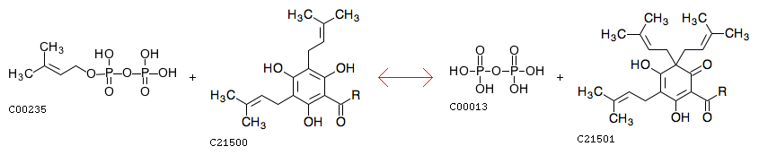 R11611 Dimethylallyl diphosphate + 2-Acyl-4,6-bisprenylphloroglucinol <=> Diphosphate + 2-Acyl-4,6,6-trisprenylcyclohexa-2,4-dien-1-one