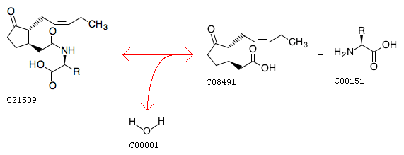 R11622 Jasmonoyl-L-amino acid + H2O <=> (-)-Jasmonic acid + L-Amino acid