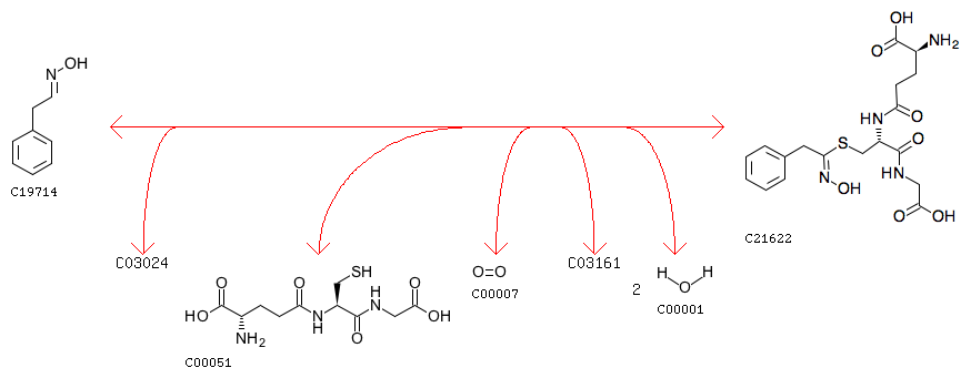 R11737 (E)-Phenylacetaldoxime + [Reduced NADPH---hemoprotein reductase] + Glutathione + Oxygen <=> S-[(Z)-N-Hydroxy(phenyl)acetimidoyl]-L-glutathione + [Oxidized NADPH---hemoprotein reductase] + 2 H2O