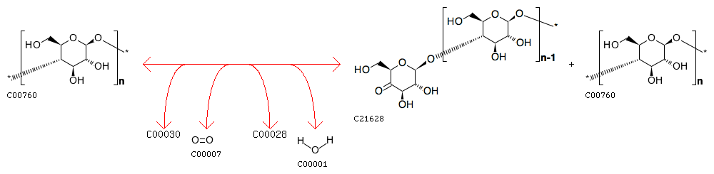 Cellulose(n+m) + Reduced acceptor + Oxygen <=> 4-Dehydro-beta-D-glucosyl-[(1->4)-beta-D-glucosyl]n-1 + Cellulose(m) + Acceptor + H2O