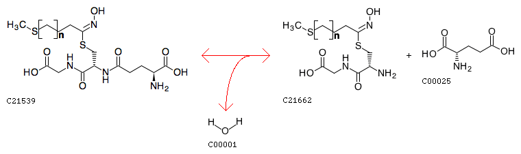 R11792 (E)-1-(Glutathione-S-yl)-omega-(methylthio)alkylhydroximate + H2O <=> (E)-1-(L-Cysteinylglycine-S-yl)-N-hydroxy-omega-(methylsulfanyl)alkane-1-imine + L-Glutamate