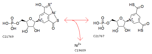 R11921 Ni(II)-pyridinium-3,5-bisthiocarboxylate mononucleotide <=> Pyridinium-3,5-bisthiocarboxylate mononucleotide + Nickel(2+)