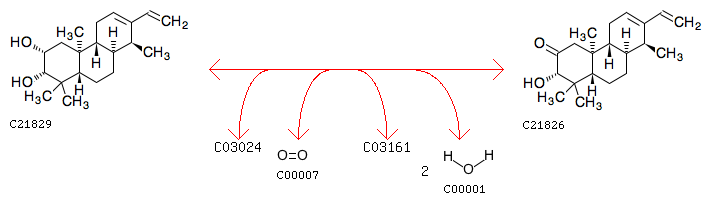 R11986 ent-Cassa-12,15-diene-2beta,3beta-diol + [Reduced NADPH---hemoprotein reductase] + Oxygen <=> ent-3beta-Hydroxycassa-12,15-dien-2-one + [Oxidized NADPH---hemoprotein reductase] + 2 H2O