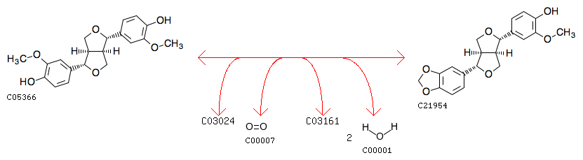 R12153 (+)-Pinoresinol + [Reduced NADPH---hemoprotein reductase] + Oxygen <=> (+)-Piperitol + [Oxidized NADPH---hemoprotein reductase] + 2 H2O