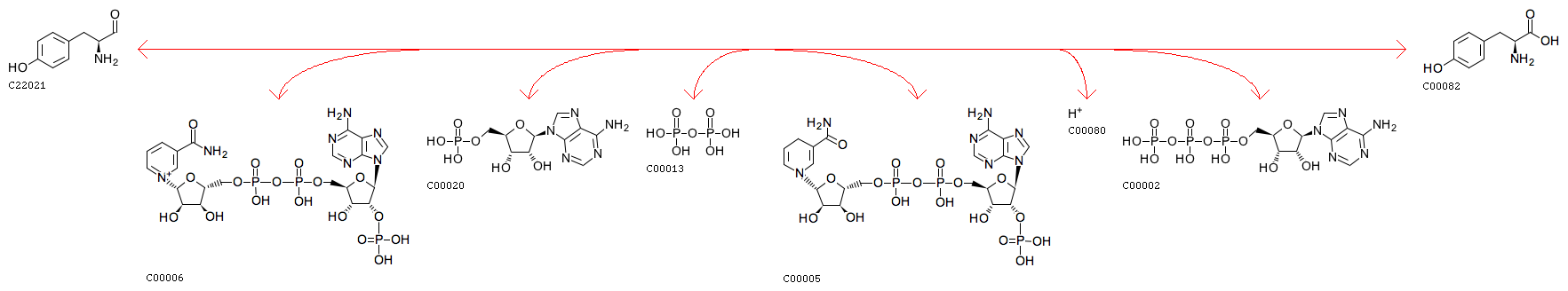 R12235 L-Tyrosinal + NADP+ + AMP + Diphosphate <=> L-Tyrosine + NADPH + H+ + ATP