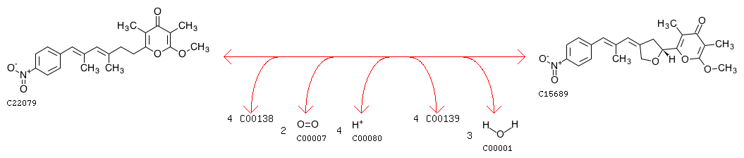 R12324 Luteothin + 4 Reduced ferredoxin + 2 Oxygen + 4 H+ <=> Aureothin + 4 Oxidized ferredoxin + 3 H2O