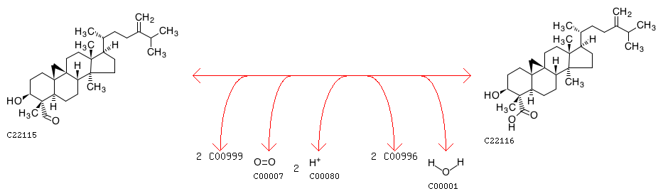 R12370 4alpha-Formyl-4beta,14alpha-dimethyl-9beta,19-cyclo-5alpha-ergost-24(24(1))-en-3beta-ol + 2 Ferrocytochrome b5 + Oxygen + 2 H+ <=> 3beta-Hydroxy-4beta,14alpha-dimethyl-9beta,19-cyclo-5alpha-ergost-24(24(1))-en-4alpha-carboxylate + 2 Ferricytochrome b5 + H2O