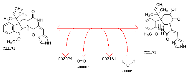 R12448 Roquefortine F + [Reduced NADPH---hemoprotein reductase] + Oxygen <=> Neoxaline + [Oxidized NADPH---hemoprotein reductase] + H2O