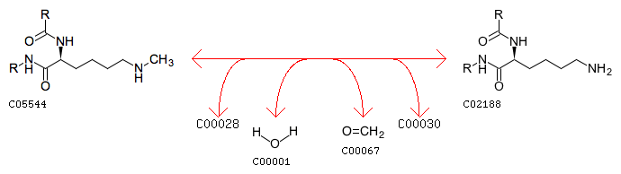 R12463 Protein N6,N6-dimethyl-L-lysine + Acceptor + H2O <=> Protein N6-methyl-L-lysine + Formaldehyde + Reduced acceptor