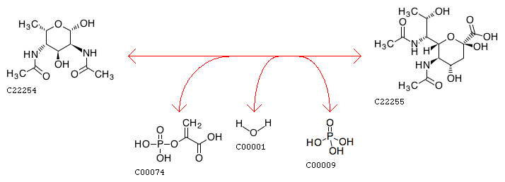 R12565 2,4-Diacetamido-2,4,6-trideoxy-beta-L-gulose + Phosphoenolpyruvate + H2O <=> 5,7-Diacetamido-3,5,7,9-tetradeoxy-L-glycero-D-galacto-non-2-ulosonic acid + Orthophosphate