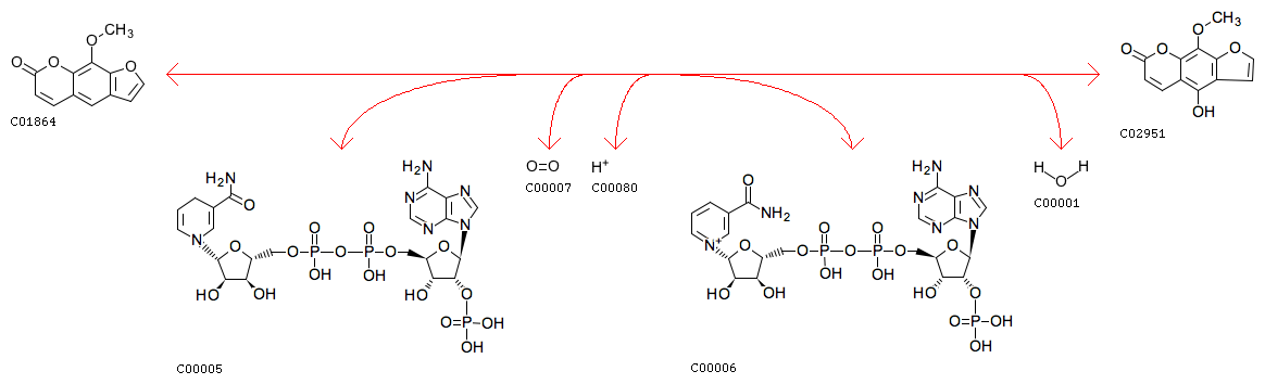 R12877 Xanthotoxin + NADPH + Oxygen + H+ <=> 5-Hydroxyxanthotoxin + NADP+ + H2O