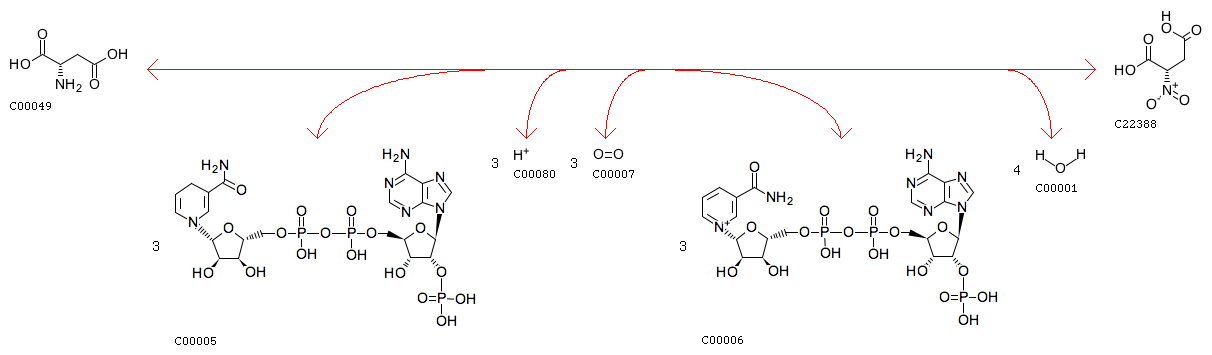 R12907 L-Aspartate + 3 NADPH + 3 H+ + 3 Oxygen <=> (2S)-2-Nitrobutanedioate + 3 NADP+ + 4 H2O