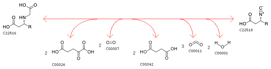 R13014 (3R)-3-[(Carboxylmethyl)amino]fatty acid + 2 2-Oxoglutarate + 2 Oxygen <=> (3R)-3-Isocyanyl-fatty acid + 2 Succinate + 3 CO2 + 2 H2O