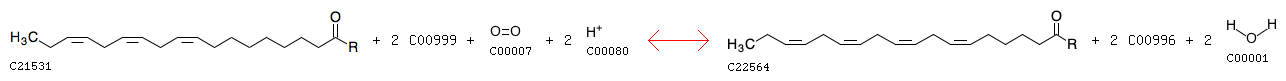 R13058 alpha-Linolenoyl-[glycerolipid] + 2 Ferrocytochrome b5 + Oxygen + 2 H+ <=> Stearidonoyl-[glycerolipid] + 2 Ferricytochrome b5 + 2 H2O