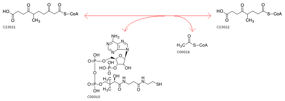 R13483 9-Carboxy-6-methyl-3,7-dioxononanoyl-CoA + CoA <=> 7-Carboxy-4-methyl-5-oxoheptanoyl-CoA + Acetyl-CoA