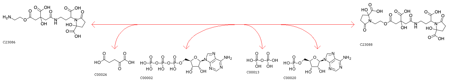 alpha-Ketoglutaryl-diaminobutyryl-citryl-ethanolamine + 2-Oxoglutarate + ATP <=> Achromobactin + Diphosphate + AMP