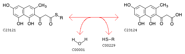 6-Hydroxymusizin-2-carbonyl-[acyl-carrier protein] + H2O <=> 6-Hydroxymusizin carboxylate + Acyl-carrier protein