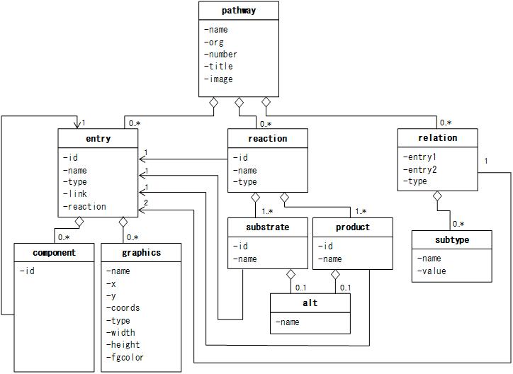 The pathway element is a root element, and one pathway element is specified for one pathway map in KGML. The entry, relation, and reaction elements specify the graph information, and additional elements are used to specify more detailed information about nodes and edges of the graph.