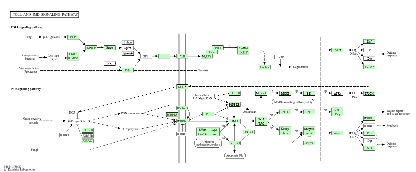 Insects, such as Drosophila, have evolved complex mechanisms to combat microbial infection. TOLL and IMD pathways are responsible for the immune response that functions through the production of antimicrobial peptides (AMPs). The TOLL pathway mainly detects fungi, Gram-positive bacteria and virulence factors (proteases et al.). Activation of the TOLL pathway results in degradation of Cactus and localization of Dorsal and Dif to the nucleus. On the other hand, the IMD pathway responses to Gram-negative bacteria and leads to the activation of Relish. Dorsal, Dif and Relish induce the transcriptional up-regulation of AMPs in the nucleus.