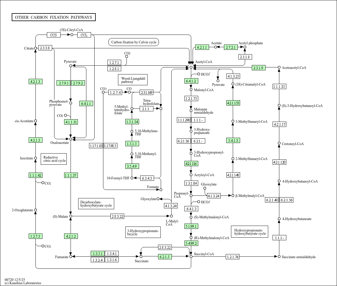 M00165]. There are, at least, five additional carbon fixation pathways known to exist in autotrophic bacteria and archaea, which differ in reducing compounds, energy source, and oxygen sensitivity of enzymes. (i) The reductive citric acid cycle (Arnon-Buchanan cycle) [MD: