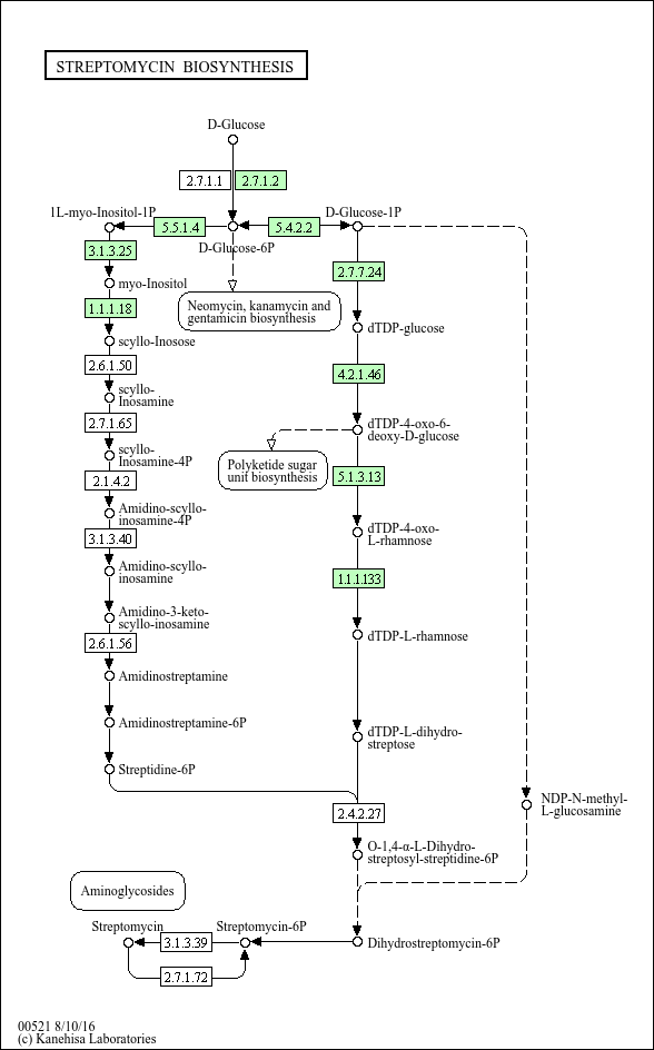 Streptomycin is an aminocyclitol-aminoglycoside antibiotic produced by Streptomyces griseus. Streptomycin consists of aminocyclitol (streptidine), 6-deoxyhexose (streptose), and N-methyl-L-glucosamine moieties, which are formed by independent biosynthetic pathways. All of the moieties are derived from D-glucose. The streptidine moiety is synthesized via myo-inositol, which is then oxidized at C-1 and transaminated to give scyllo-inosamine. After phosphorylation, the compound is transamidinated by arginine. The same procedure is repeated at the C-3 position. The streptose moiety is made from D-glucose via a dTDP-glucose pathway. The exact biosynthetic route for the N-methyl-L-glucosamine moiety is unknown, though the biosynthetic gene cluster have been proposed.