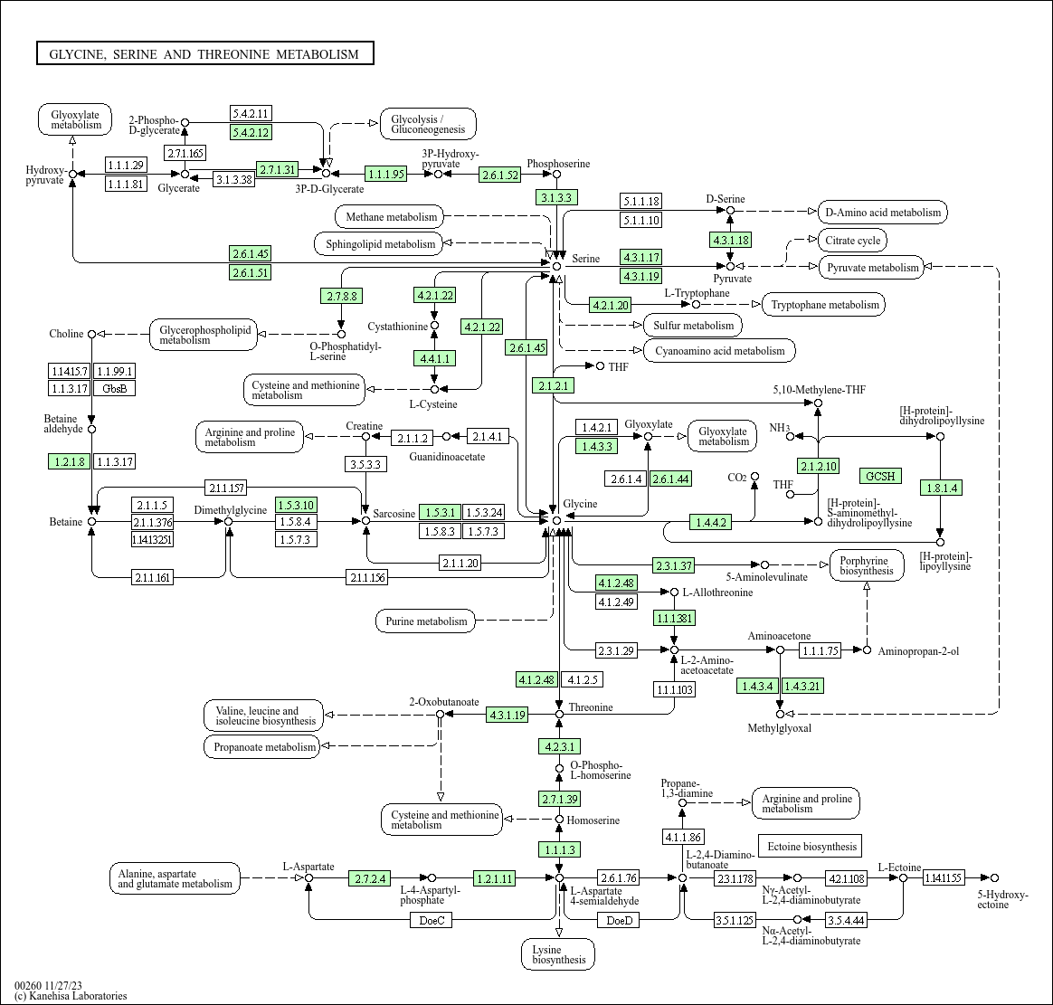 M00020], and glycine is derived from serine. Threonine is an essential amino acid, which animals cannot synthesize. In bacteria and plants, threonine is derived from aspartate [MD: