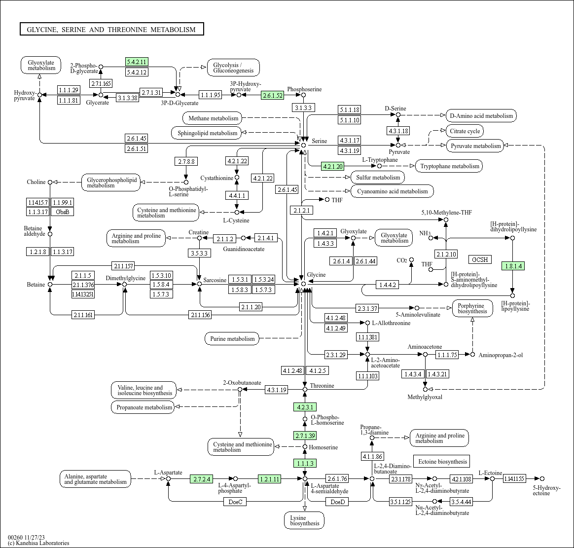 M00020], and glycine is derived from serine. Threonine is an essential amino acid, which animals cannot synthesize. In bacteria and plants, threonine is derived from aspartate [MD: