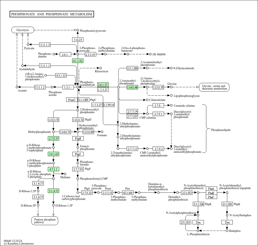 Natural products containing carbon-phosphorous bonds, so-called C-P compounds, are derivatives of phosphonate and phosphinate with substitution of alkyl group for hydrogen of phosphorus-hydrogen bonds. C-P compounds have been found in many organisms, but only protists and bacteria, mostly Actinobacteria, have biosynthetic capacity. A common reaction in the biosynthetic pathway is C-P bond forming reaction from phosphoenolpyruvate (PEP) to phosphonopyruvate (PnPy) catalyzed by PEP phosphomutase. 2-Aminoethylphosphonate (AEP) is the most abundant C-P compound in the natural world. AEP derivatives include phosphonoprotein, phosphonoglycan, and phosphonolipid. Other known C-P compounds are bioactive substances used in medicine (antibiotics) and agriculture (herbicide) such as fosfomycin, FR-33289, rhizocticin, and bialaphos.