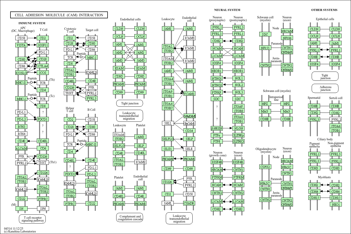 Cell adhesion molecules (CAMs) are (glyco)proteins expressed on the cell surface and play a critical role in a wide array of biologic processes that include hemostasis, the immune response, inflammation, embryogenesis, and development of neuronal tissue. There are four main groups: the integrin family, the immunoglobulin superfamily, selectins, and cadherins. Membrane proteins that mediate immune cell–cell interactions fall into different categories, namely those involved in antigen recognition, costimulation and cellular adhesion. Furthermore cell-cell adhesions are important for brain morphology and highly coordinated brain functions such as memory and learning. During early development of the nervous system, neurons elongate their axons towards their targets and establish and maintain synapses through formation of cell-cell adhesions. Cell-cell adhesions also underpin axon-axon contacts and link neurons with supporting schwann cells and oligodendrocytes.