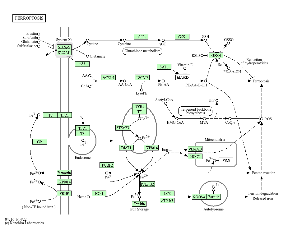 Ferroptosis is a regulated form of cell death and characterized by a production of reactive oxygen species (ROS) from accumulated iron and lipid peroxidation. It can be induced by experimental compounds (e.g.,erastin, RSL3) or clinical drugs(e.g., sulfasalazine, sorafenib) in cancer cell and certain normal cells. It is involved in multiple physiological and pathological processes, such as cancer cell death, neurodegenerative disease, tissue damage and acute renal failure.