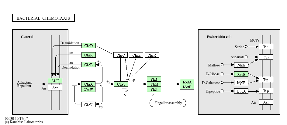 Chemotaxis is the process by which cells sense chemical gradients in their environment and then move towards more favorable conditions. In chemotaxis, events at the receptors control autophosphorylation of the CheA histidine kinase, and the phosphohistidine is the substrate for the response regulator CheY, which catalyzes the transfer of the phosphoryl group to a conserved aspartate. The resulting CheY-P can interact with the switch mechanism in the motor. This interaction causes a change in behavior, such as in direction or speed of rotation of flagella.