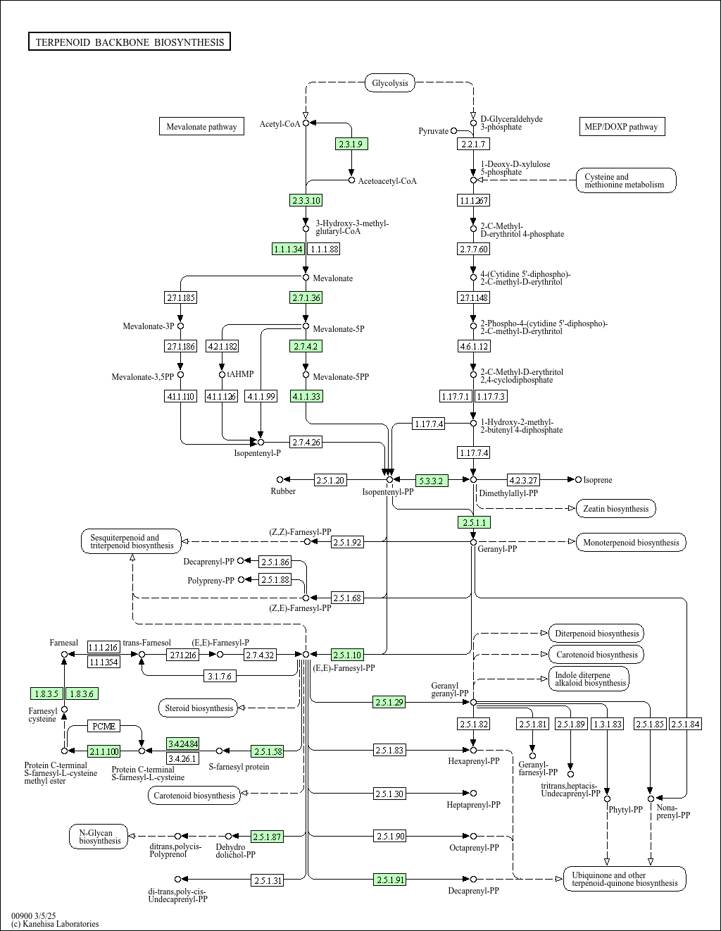 Terpenoids, also known as isoprenoids, are a large class of natural products consisting of isoprene (C5) units. There are two biosynthetic pathways, the mevalonate pathway [MD: