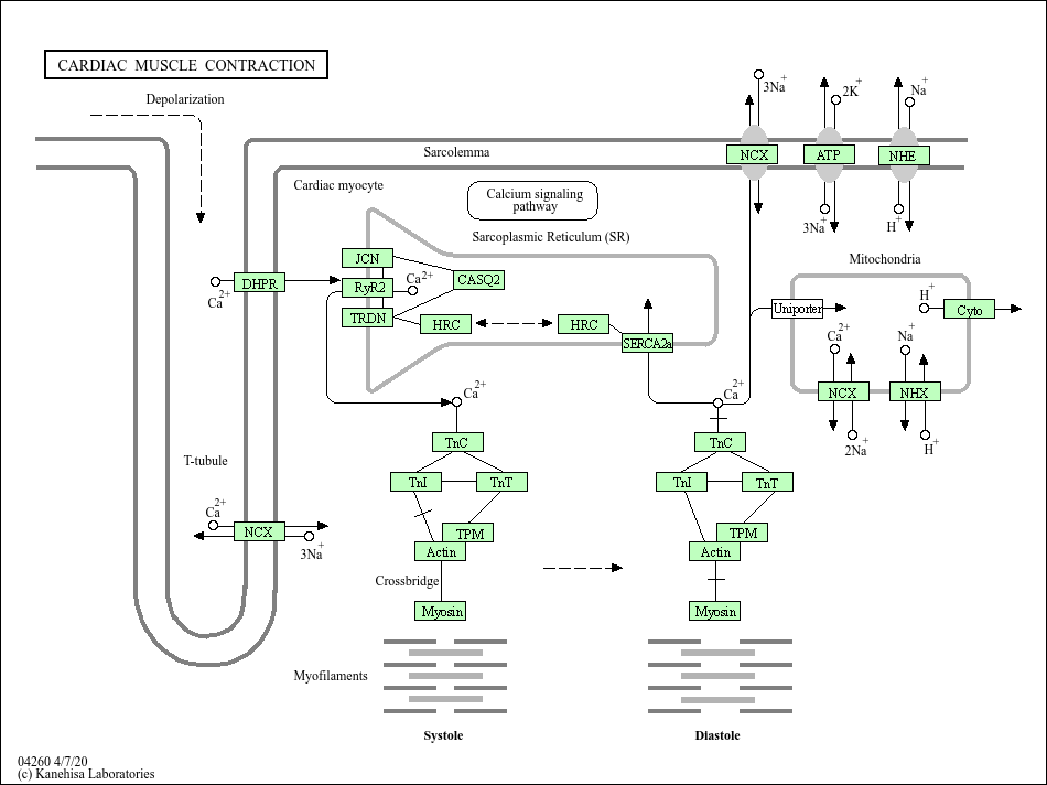 Contraction of the heart is a complex process initiated by the electrical excitation of cardiac myocytes (excitation-contraction coupling, ECC). In cardiac myocytes, Ca2+ influx induced by activation of voltage-dependent L-type Ca channels (DHP receptors) upon membrane depolarization triggers the release of Ca2+ via Ca2+ release channels (ryanodine receptors) of sarcoplasmic reticulum (SR) through a Ca2+ -induced Ca release (CICR) mechanism. Ca2+ ions released via the CICR mechanism diffuse through the cytosolic space to contractile proteins to bind to troponinC resulting in the release of inhibition induced by troponinI. The Ca2+ binding to troponinC thereby triggers the sliding of thin and thick filaments, that is, the activation of a crossbridge and subsequent cardiac force development and/or cell shortening. Recovery occurs as Ca2+ is pumped out of the cell by the Na+/Ca2+ exchanger (NCX) or is returned to the sarcoplasmic reticulum (SR) by sarco(endo)plasmic Ca2+ -ATPase (SERCA) pumps on the non-junctional region of the SR.