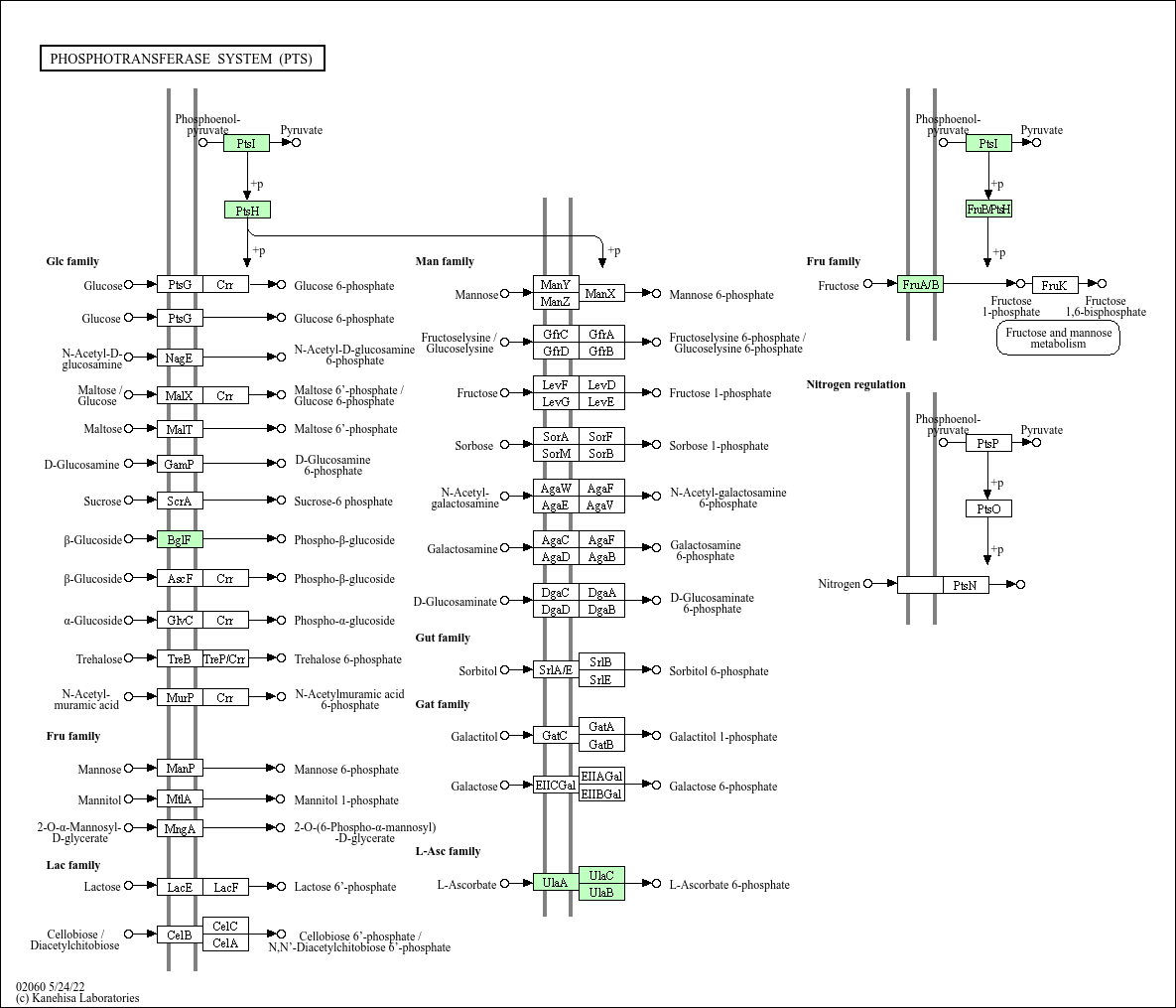 The phosphoenolpyruvate (PEP)-dependent phosphotransferase system (PTS) is a major mechanism used by bacteria for uptake of carbohydrates, particularly hexoses, hexitols, and disaccharides, where the source of energy is from PEP. The PTS consists of two general components, enzyme I (EI) and histidine phosphocarrier protein (HPr), and of membrane-bound sugar specific permeases (enzymes II). Each enzyme II (EII) complex consists of one or two hydrophobic integral membrane domains (domains C and D) and two hydrophilic domains (domains A and B). EII complexes may exist as distinct proteins or as a single multidomain protein. The PTS catalyzes the uptake of carbohydrates and their conversion into their respective phosphoesters during transport. There are four successive phosphoryl transfers in the PTS. Initial autophosphorylation of EI, using PEP as a substrate, is followed by transfer of the phosphoryl group from EI to HPr. EIIA catalyzes the self-phosphoryl transfer from HPr after which the phosphoryl group is transferred to histidine or cysteine residues of EIIB. The sugar is transported through the membrane-bound EIIC and is phosphorylated by the appropriate sugar-specific EIIB.