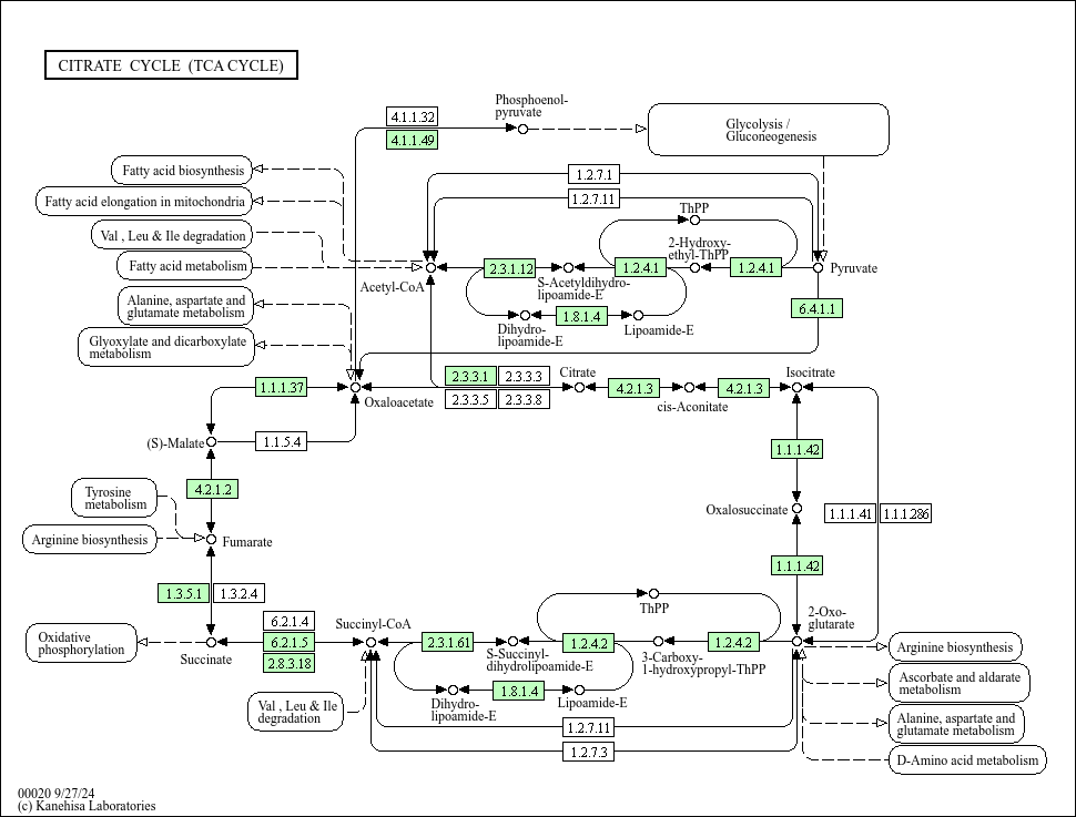 The citrate cycle (TCA cycle, Krebs cycle) is an important aerobic pathway for the final steps of the oxidation of carbohydrates and fatty acids. The cycle starts with acetyl-CoA, the activated form of acetate, derived from glycolysis and pyruvate oxidation for carbohydrates and from beta oxidation of fatty acids. The two-carbon acetyl group in acetyl-CoA is transferred to the four-carbon compound of oxaloacetate to form the six-carbon compound of citrate. In a series of reactions two carbons in citrate are oxidized to CO2 and the reaction pathway supplies NADH for use in the oxidative phosphorylation and other metabolic processes. The pathway also supplies important precursor metabolites including 2-oxoglutarate. At the end of the cycle the remaining four-carbon part is transformed back to oxaloacetate. According to the genome sequence data, many organisms seem to lack genes for the full cycle [MD: