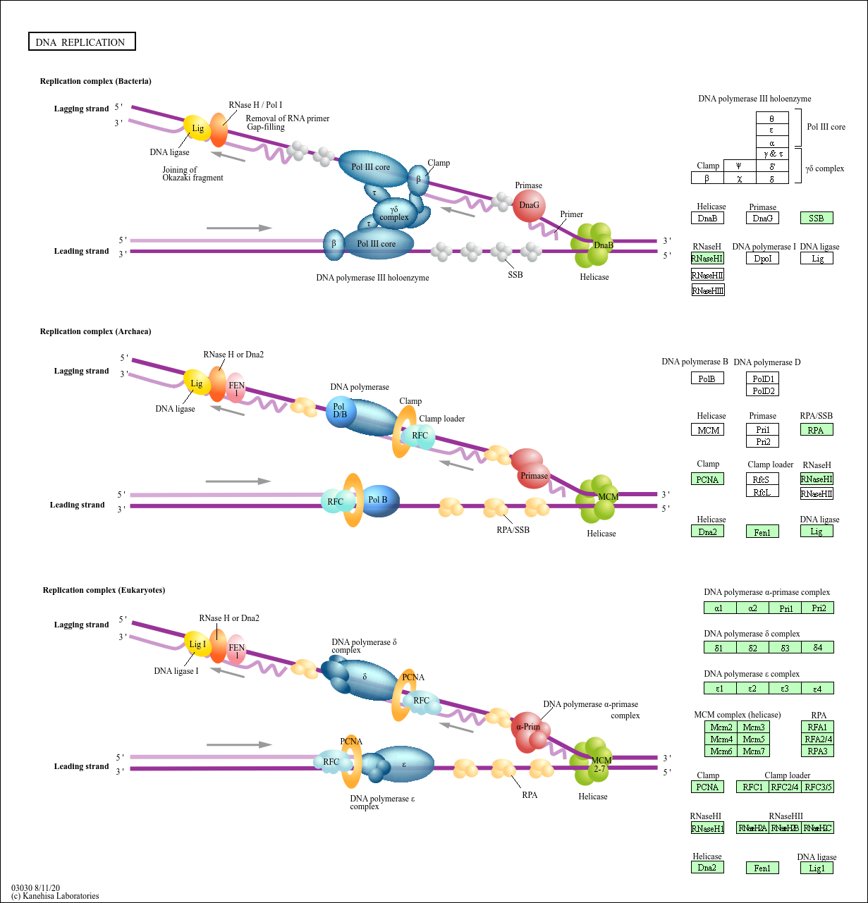A complex network of interacting proteins and enzymes is required for DNA replication. Generally, DNA replication follows a multistep enzymatic pathway. At the DNA replication fork, a DNA helicase (DnaB or MCM complex) precedes the DNA synthetic machinery and unwinds the duplex parental DNA in cooperation with the SSB or RPA. On the leading strand, replication occurs continuously in a 5 to 3 direction, whereas on the lagging strand, DNA replication occurs discontinuously by synthesis and joining of short Okazaki fragments. In prokaryotes, the leading strand replication apparatus consists of a DNA polymerase (pol III core), a sliding clamp (beta), and a clamp loader (gamma delta complex). The DNA primase (DnaG) is needed to form RNA primers. Normally, during replication of the lagging-strand DNA template, an RNA primer is removed either by an RNase H or by the 5 to 3 exonuclease activity of DNA pol I, and the DNA ligase joins the Okazaki fragments. In eukaryotes, three DNA polymerases (alpha, delta, and epsilon) have been identified. DNA primase forms a permanent complex with DNA polymerase alpha. PCNA and RFC function as a clamp and a clamp loader. FEN 1 and RNase H1 remove the RNA from the Okazaki fragments and DNA ligase I joins the DNA.