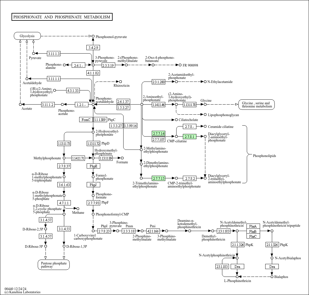 Natural products containing carbon-phosphorous bonds, so-called C-P compounds, are derivatives of phosphonate and phosphinate with substitution of alkyl group for hydrogen of phosphorus-hydrogen bonds. C-P compounds have been found in many organisms, but only protists and bacteria, mostly Actinobacteria, have biosynthetic capacity. A common reaction in the biosynthetic pathway is C-P bond forming reaction from phosphoenolpyruvate (PEP) to phosphonopyruvate (PnPy) catalyzed by PEP phosphomutase. 2-Aminoethylphosphonate (AEP) is the most abundant C-P compound in the natural world. AEP derivatives include phosphonoprotein, phosphonoglycan, and phosphonolipid. Other known C-P compounds are bioactive substances used in medicine (antibiotics) and agriculture (herbicide) such as fosfomycin, FR-33289, rhizocticin, and bialaphos.