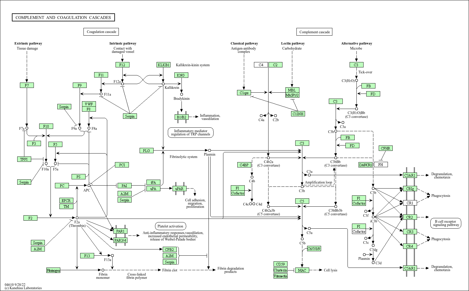 The complement system is a proteolytic cascade in blood plasma and a mediator of innate immunity, a nonspecific defense mechanism against pathogens. There are three pathways of complement activation: the classical pathway, the lectin pathway, and the alternative pathway. All of these pathways generate a crucial enzymatic activity that, in turn, generates the effector molecules of complement. The main consequences of complement activation are the opsonization of pathogens, the recruitment of inflammatory and immunocompetent cells, and the direct killing of pathogens. Blood coagulation is another series of proenzyme-to-serine protease conversions, culminating the formation of thrombin, the enzyme responsible for the conversion of soluble fibrinogen to the insoluble fibrin clot. Protease-activated receptors, such as those activated by thrombin, are members of G protein-coupled receptors and function as a mediator of innate immunity. The kallikrein-kinin system is an endogenous metabolic cascade, triggering of which results in the release of vasoactive kinins (bradykinin-related peptides). Kinin peptides are implicated in many physiological and pathological processes including the regulation of blood pressure and sodium homeostasis, inflammatory processes, and the cardioprotective effects of preconditioning.