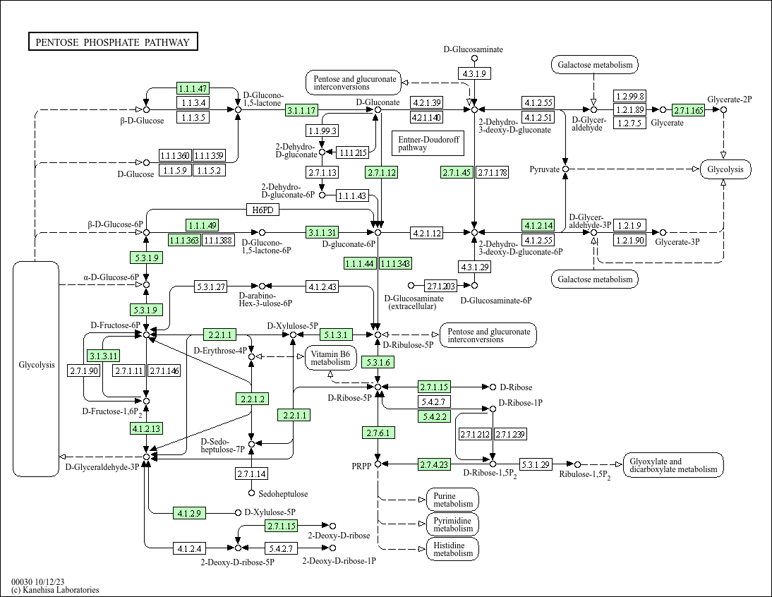 M00005] is an activated compound used in the biosynthesis of histidine and purine/pyrimidine nucleotides. This pathway map also shows the Entner-Doudoroff pathway where 6-P-gluconate is dehydrated and then cleaved into pyruvate and glyceraldehyde-3P [MD: