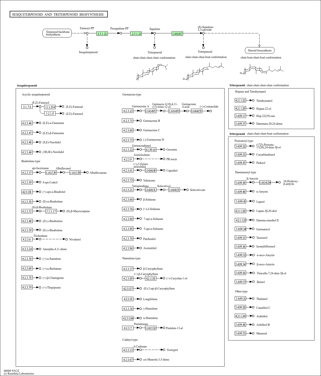 Sesquiterpenoids (C15 terpenoids) are a group of terpenoids consisting of three isoprene units. They are derive from farnesyl diphosphate (FPP) and can be cyclized to produce various skeletal structures. Sesquiterpenoid biosynthesis begins with the loss of diphosphate from FPP under the action of sesquiterpene synthesis enzymes, generating an allylic cation that is highly susceptible to intramolecular attacks. Cyclization of the farnesyl cation may take place onto either of the remaining double bonds with the result that 6-, 10-, or 11-membered rings may be formed. Many sesquiterpenoids have been isolated from plants, fungi, marine organisms, and Streptomyces species. This map shows a few examples of acyclic and cyclic sesquiterpenoids.