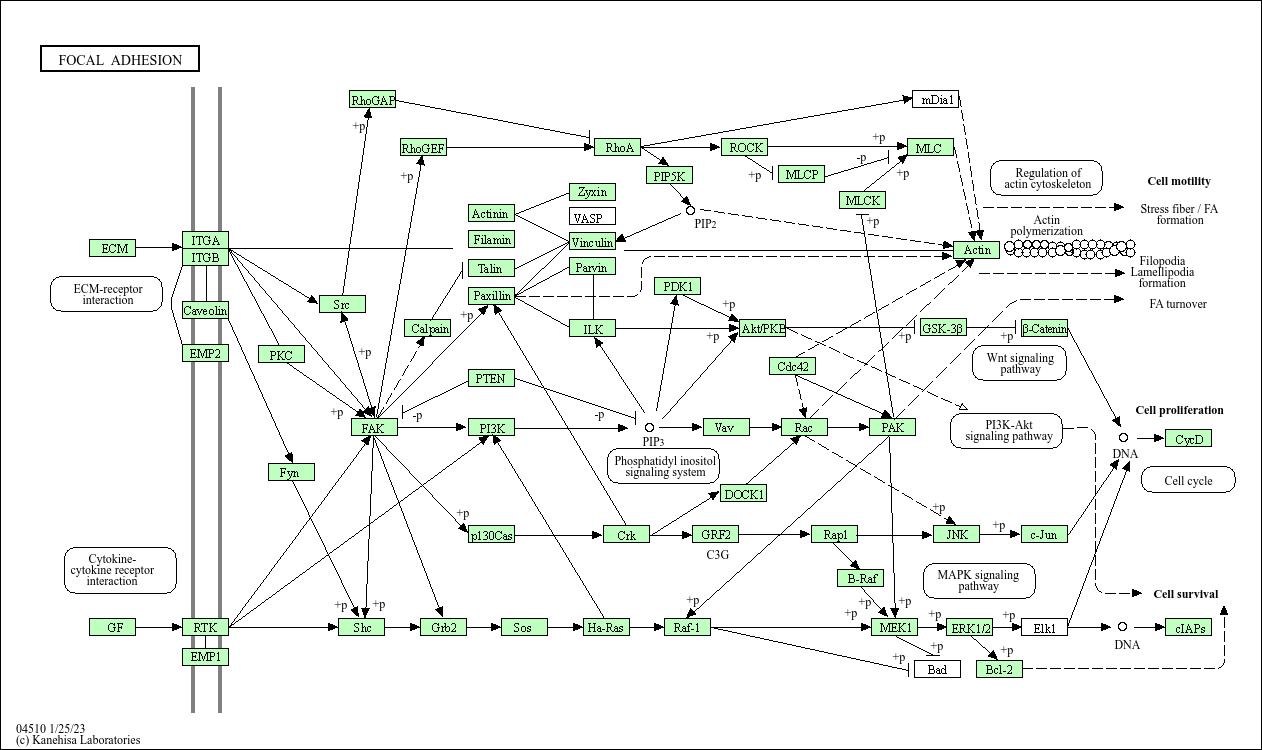 Cell-matrix adhesions play essential roles in important biological processes including cell motility, cell proliferation, cell differentiation, regulation of gene expression and cell survival. At the cell-extracellular matrix contact points, specialized structures are formed and termed focal adhesions, where bundles of actin filaments are anchored to transmembrane receptors of the integrin family through a multi-molecular complex of junctional plaque proteins. Some of the constituents of focal adhesions participate in the structural link between membrane receptors and the actin cytoskeleton, while others are signalling molecules, including different protein kinases and phosphatases, their substrates, and various adapter proteins. Integrin signaling is dependent upon the non-receptor tyrosine kinase activities of the FAK and src proteins as well as the adaptor protein functions of FAK, src and Shc to initiate downstream signaling events. These signalling events culminate in reorganization of the actin cytoskeleton; a prerequisite for changes in cell shape and motility, and gene expression. Similar morphological alterations and modulation of gene expression are initiated by the binding of growth factors to their respective receptors, emphasizing the considerable crosstalk between adhesion- and growth factor-mediated signalling.