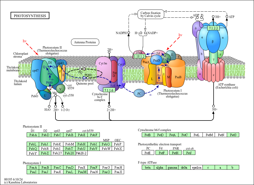 Photosynthesis in green plants and specialized bacteria is the process of utilizing light energy to synthesize organic compounds from carbon dioxide and water. It consists of the light dependent part (light reaction) and the light independent part (dark reaction, carbon fixation). The light reaction takes place in thylakoid, a membrane-bound compartment inside chloroplasts and cyanobacteria. The light energy is used by photosystems I and II to generate proton motive force and reducing power (NADPH or NADH). The proton motive force is used by ATP synthase to generate ATP, essentially in the same way as the mitochondrial respiratory chain. The supplies of ATP and NAD(P)H are then used to fix carbon dioxide.