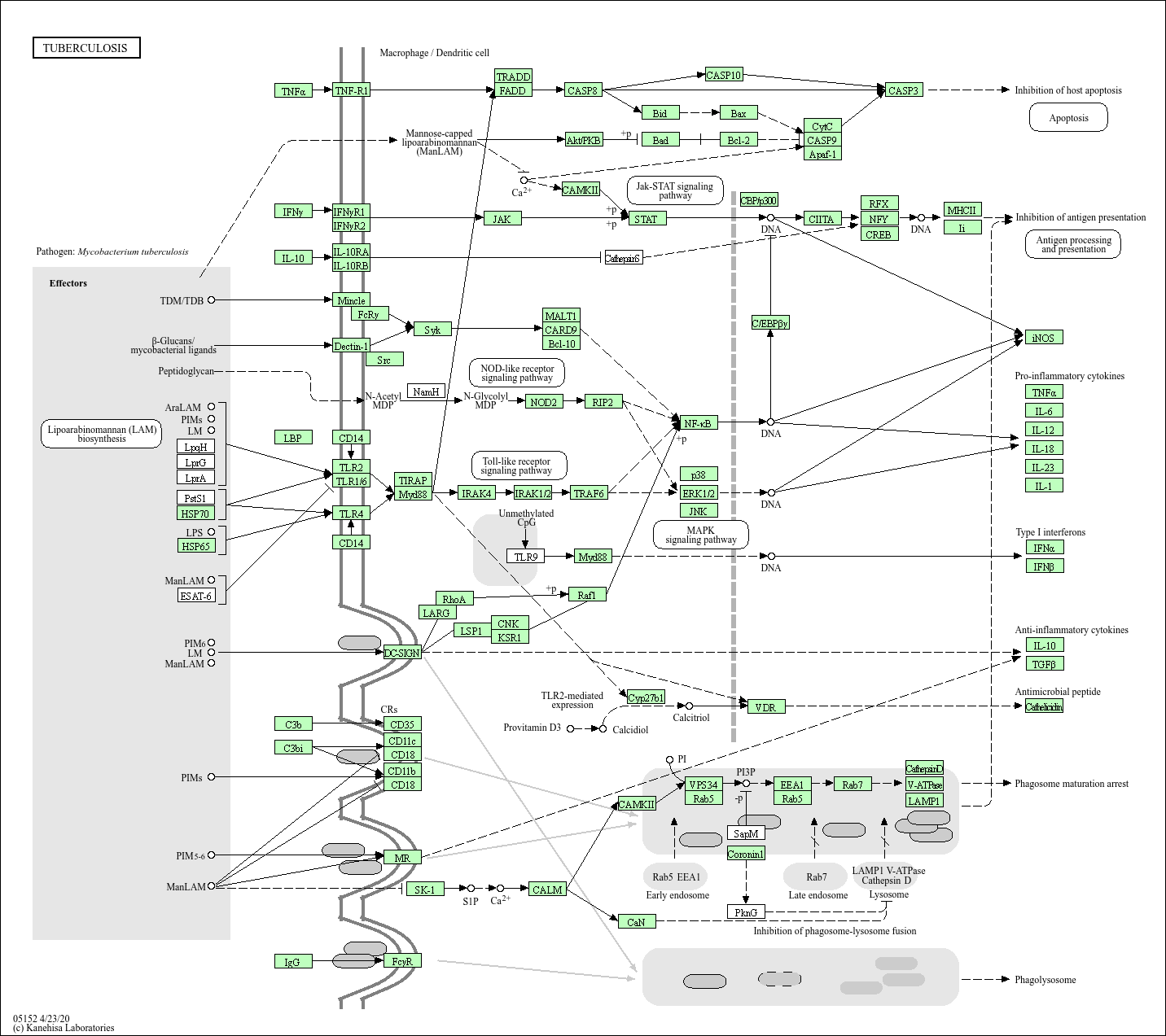 Tuberculosis, or TB, is an infectious disease caused by Mycobacterium tuberculosis. One third of the world's population is thought to be infected with TB. About 90% of those infected result in latent infections, and about 10% of latent infections develop active diseases when their immune system is impaired due to the age, other diseases such as AIDS or exposure to immunosuppressive drugs. TB is transmitted through the air and primarily attacks the lungs, then it can spread by the circulatory system to other parts of body. Once TB bacilli have entered the host by the respiratory route and infected macrophages in the lungs, they interfere with phagosomal maturation, antigen presentation, apoptosis and host immune system to establish persistent or latent infection.