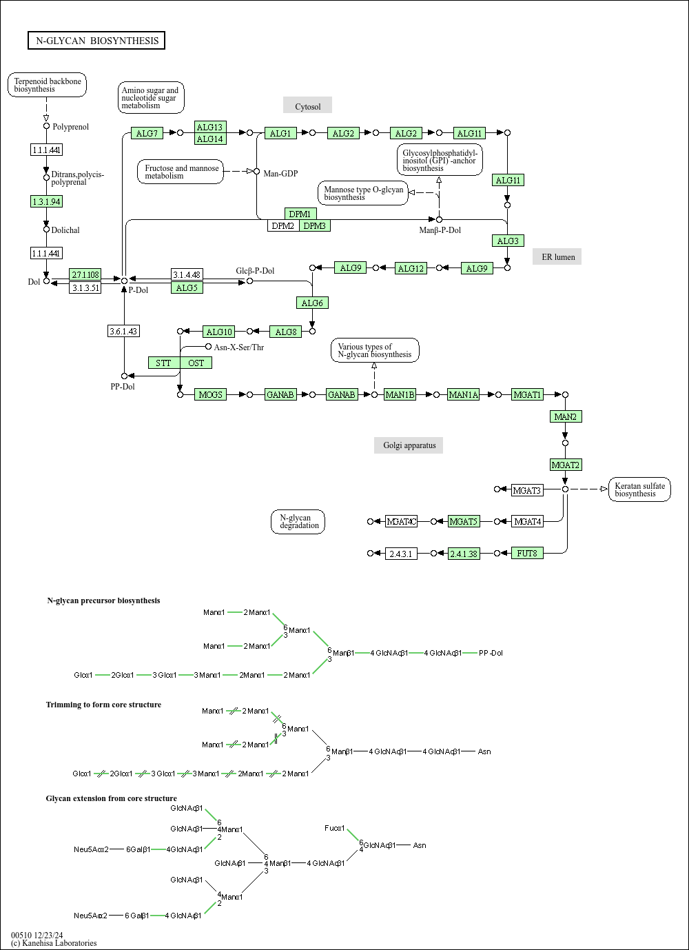 M00055], the N-glycan precursor is attached by the OST (oligosaccharyltransferase) complex to the polypeptide chain that is being synthesized and translocated through the ER membrane. The protein-bound N-glycan precursor is subsequently trimmed, extended, and modified in the ER and Golgi by a complex series of reactions catalyzed by membrane-bound glycosidases and glycosyltransferases. N-glycans thus synthesized are classified into three types: high-mannose type, complex type, and hybrid type. Defects in N-glycan biosynthesis lead to a variety of human diseases known as congenital disorders of glycosylation [DS:
