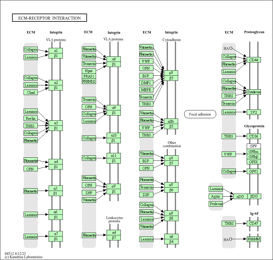 The extracellular matrix (ECM) consists of a complex mixture of structural and functional macromolecules and serves an important role in tissue and organ morphogenesis and in the maintenance of cell and tissue structure and function. Specific interactions between cells and the ECM are mediated by transmembrane molecules, mainly integrins and perhaps also proteoglycans, CD36, or other cell-surface-associated components. These interactions lead to a direct or indirect control of cellular activities such as adhesion, migration, differentiation, proliferation, and apoptosis. In addition, integrins function as mechanoreceptors and provide a force-transmitting physical link between the ECM and the cytoskeleton. Integrins are a family of glycosylated, heterodimeric transmembrane adhesion receptors that consist of noncovalently bound alpha- and beta-subunits.