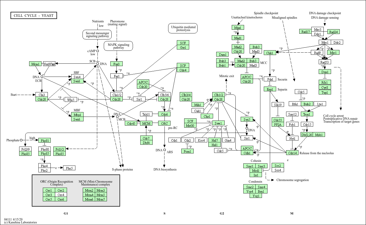 Mitotic cell cycle progression is accomplished through a reproducible sequence of events, DNA replication (S phase) and mitosis (M phase) separated temporally by gaps (G1 and G2 phases). G1, S, and G2 phases are collectively known as interphase. In yeast Cdc28 is the catalytic subunit of the cyclin-dependent kinase (CDK). At G1 phase Cdc28 associates with G1-cyclins Cln1 to Cln3, while B-type cyclins Clb1 to Clb6 regulate Cdc28 during S, G2, and M phases. Cln3/Cdc28 activity is required for cells to pass through 'start', the commitment point in G1. When Cln3/Cdc28 accumulates more than a certain threshold, SBF (Swi4/Swi6) and MBF (Mbp1/Swi6) are activated, promoting transcription of Cln1, Cln2, and other genes required for S-phase progression. Cln1 and Cln2 interacting with Cdc28 promote activation of B-type cyclin associated CDK, which drives DNA replication and entry into mitosis. Specifically, Cdc28 association with Clb2 and Clb1 promotes entry into mitosis. Cells suffering from DNA damage, spindle misorientation, or spindle assembly defect do not undergo the metaphase-anaphase transition for chromosome segregation and fail to exit from mitosis. The spindle assembly checkpoint activates Mad2, which in turn prevents chromosome segregation by inhibiting degradation of the securin Pds1. Moreover, Pds1 is phosphorylated and stabilized in response to DNA damage in a Chk1-dependent manner. The spindle checkpoint is also involved in the Cdc14 release from the nucleolus. Cdc14 dephosphorylates Swi5, Sic1, and Cdh1, leading to inhibition of Cdc28 and degradation of cyclin required for mitotic exit.