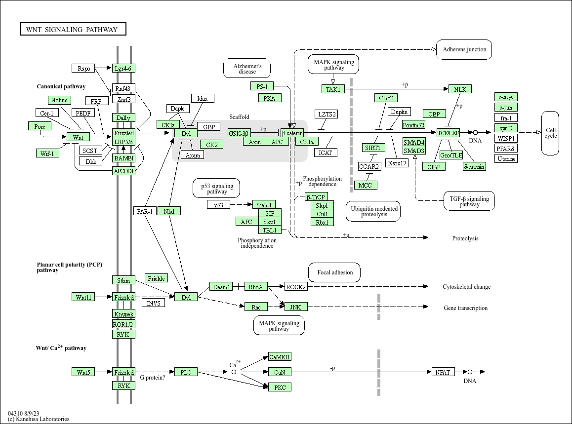 Wnt proteins are secreted morphogens that are required for basic developmental processes, such as cell-fate specification, progenitor-cell proliferation and the control of asymmetric cell division, in many different species and organs. There are at least three different Wnt pathways: the canonical pathway, the planar cell polarity (PCP) pathway and the Wnt/Ca2+ pathway. In the canonical Wnt pathway, the major effect of Wnt ligand binding to its receptor is the stabilization of cytoplasmic beta-catenin through inhibition of the bea-catenin degradation complex. Beta-catenin is then free to enter the nucleus and activate Wnt-regulated genes through its interaction with TCF (T-cell factor) family transcription factors and concomitant recruitment of coactivators. Planar cell polarity (PCP) signaling leads to the activation of the small GTPases RHOA (RAS homologue gene-family member A) and RAC1, which activate the stress kinase JNK (Jun N-terminal kinase) and ROCK (RHO-associated coiled-coil-containing protein kinase 1) and leads to remodelling of the cytoskeleton and changes in cell adhesion and motility. WNT-Ca2+ signalling is mediated through G proteins and phospholipases and leads to transient increases in cytoplasmic free calcium that subsequently activate the kinase PKC (protein kinase C) and CAMKII (calcium calmodulin mediated kinase II) and the phosphatase calcineurin.