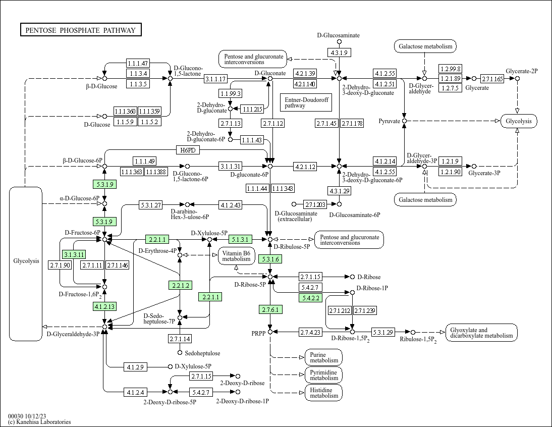 M00006]. The other is reversible non-oxidative phase in which phosphorylated sugars are interconverted to generate xylulose-5P, ribulose-5P, and ribose-5P [MD: