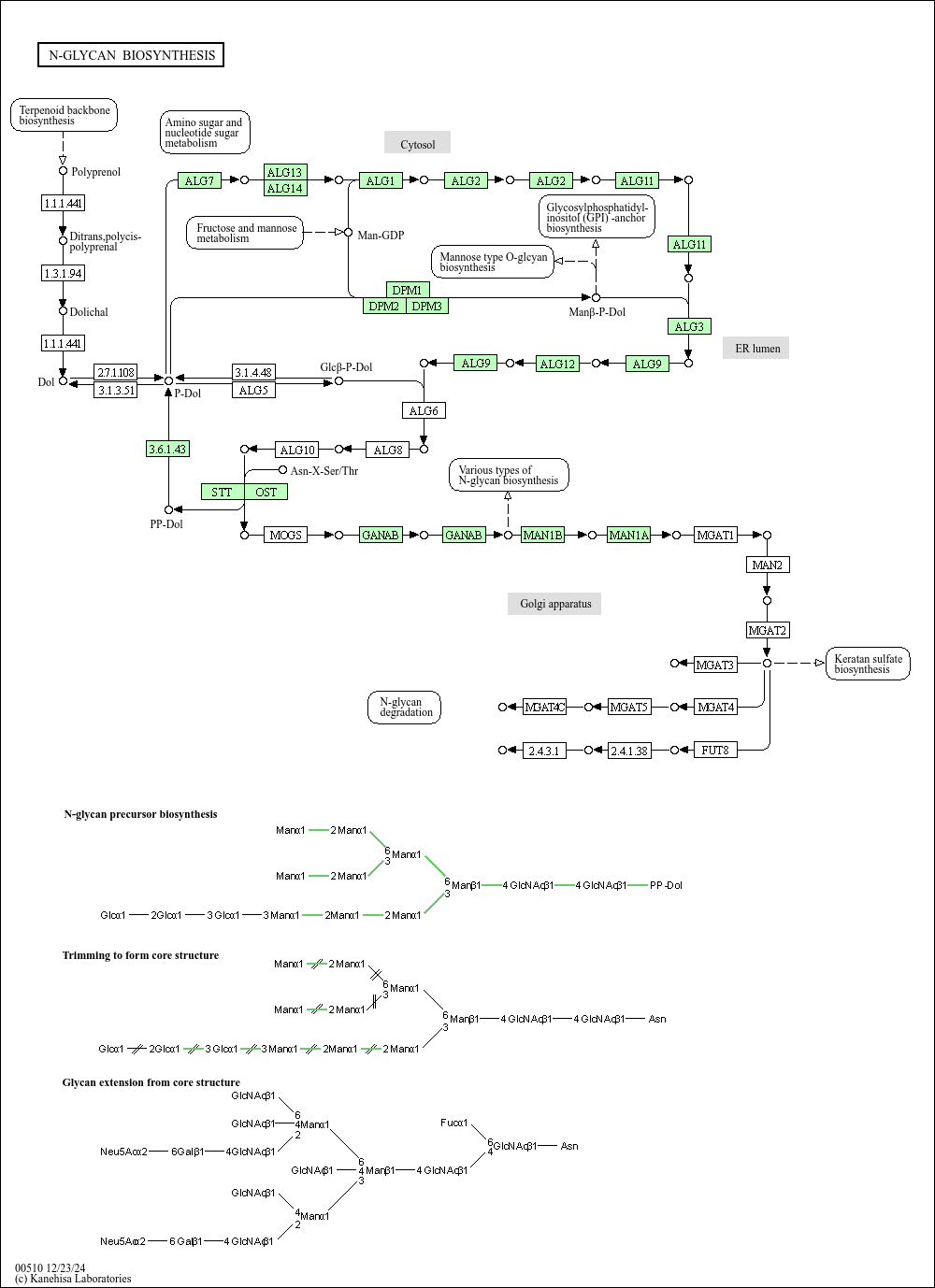M00055], the N-glycan precursor is attached by the OST (oligosaccharyltransferase) complex to the polypeptide chain that is being synthesized and translocated through the ER membrane. The protein-bound N-glycan precursor is subsequently trimmed, extended, and modified in the ER and Golgi by a complex series of reactions catalyzed by membrane-bound glycosidases and glycosyltransferases. N-glycans thus synthesized are classified into three types: high-mannose type, complex type, and hybrid type. Defects in N-glycan biosynthesis lead to a variety of human diseases known as congenital disorders of glycosylation [DS: